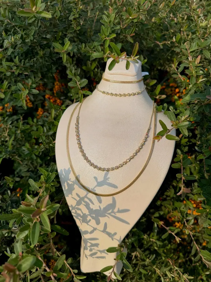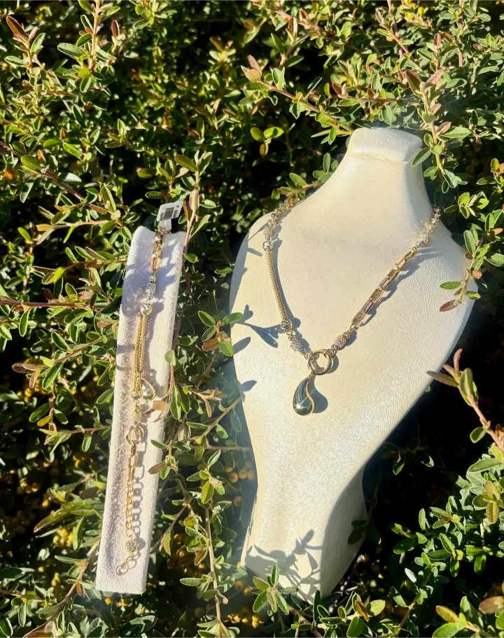 İş toplantılarında profesyonel görünüm sağlayan zarif set. Geometrik taş detayları minimalist şıklık sunar. Anne-kız veya arkadaşlarla paylaşılabilir ikili kolye.